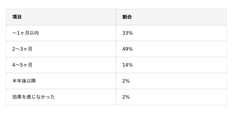 効果を実感し始めた時期について、約半数の人が「2~3ヶ月」と回答しました。