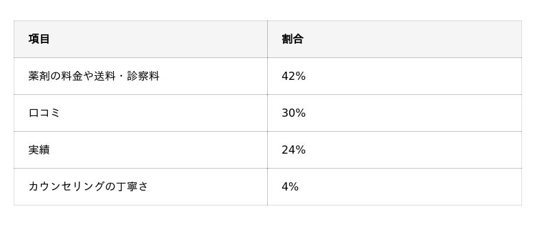 - クリニックを選んだ決め手は「薬剤の料金や送料・診察料」という回答が42%で最多