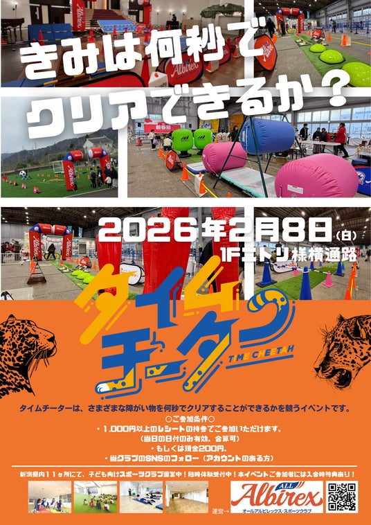 子ども向けスポーツクラブ「オールアルビレックス・スポーツクラブ」は、アピタパワー新潟亀田店にて、障がい物コースのタイムを計測して楽しむイベント「タイムチーター」を開催します。