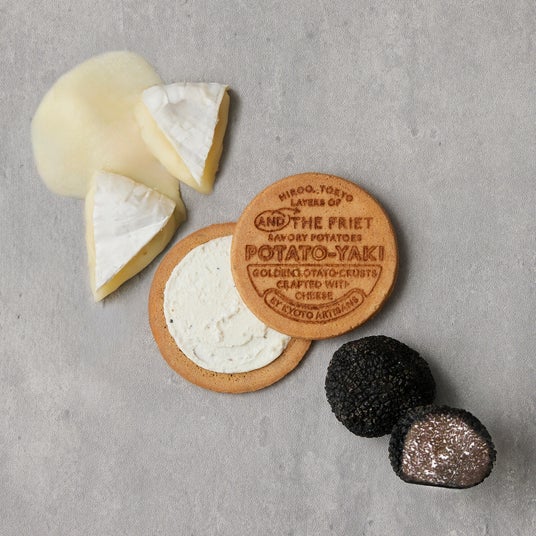 御芋焼は、じゃがいもをベースにオニオンやペッパーを練り込んだ生地を、京都に100年以上伝わる伝統的な京せんべいの製法で職人が一枚一枚丁寧に焼き上げた新発想のポテトスナックならぬ“御芋菓子”。サクッと軽やかな歯ごたえの生地には、黒トリュフの風味豊かなカマンベールチーズクリームをサンドしました。ほんのり上品な甘みの中にも芋の旨味、ペッパーのアクセントが織りなす和と洋のハーモニーは、ありそうでなかった新鮮な味わいです。