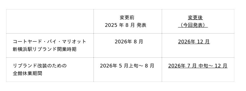 当社グループである株式会社ジェイアール東海ホテルズが運営する新横浜駅直上の「ホテルアソシア新横浜」を「コートヤード・バイ・マリオット新横浜駅」としてリブランド開業することを2025年8月28日に発表し、準備を進めてまいりましたが、以下のとおり、リブランド開業時期等のスケジュールを変更することになりましたので、お知らせいたします。