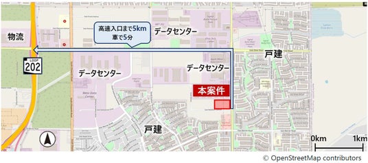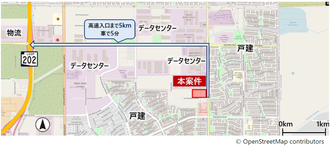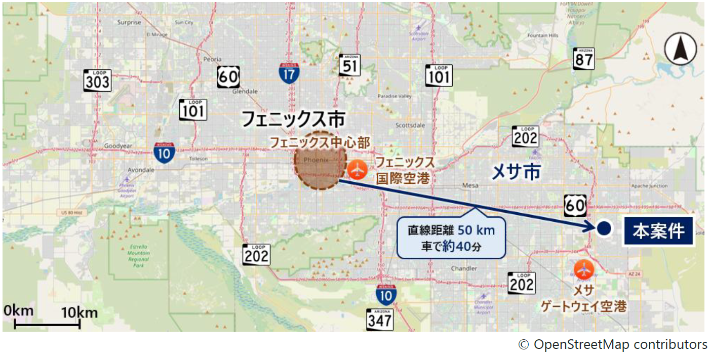メサ市は、アリゾナ州の中部に位置する人口約51万人の都市で、近年人口増加や企業進出が著しいフェニックス都市圏(人口約519万人)に位置しています。開発エリアは、高速道路・空港へのアクセスが優れており、大手企業のデータセンターや物流施設が多数立地するなど、今後も物流施設需要が見込まれます。