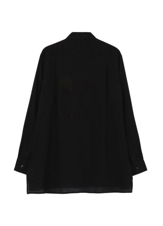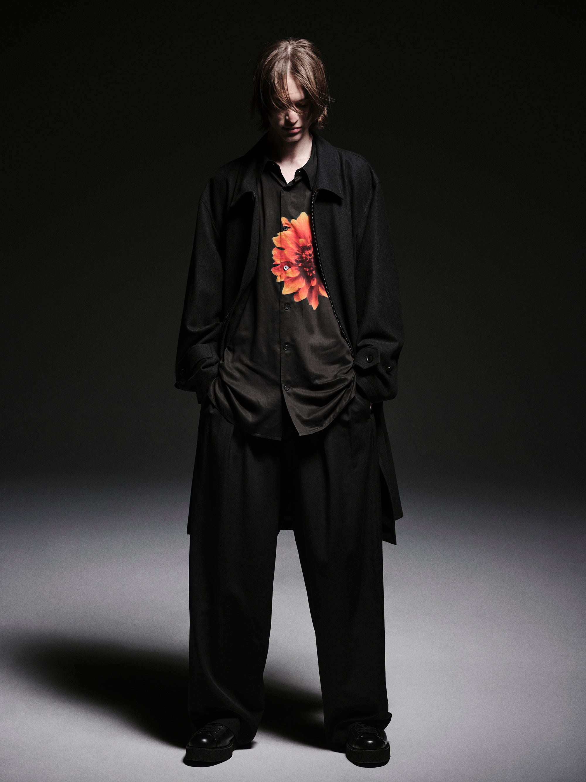 黒のボディに色彩が鮮やかな花が際立ち、軽やかなドレープ感が特徴の薄手レーヨンを使用することで、しなやかで上品な落ち着きを実現しました。闇の中から浮かび上がるような花のプリントは、かすかなシャドー感を伴い、奥行きのある表情を演出。幅広いコーディネートに自然と溶け込む一着です。