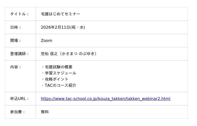 宅建士試験対策講座を展開しているTAC株式会社(東京都千代田区、代表取締役:多田敏男)は、2/11(祝水)に宅建試験に説明する無料オンラインセミナーを開催します。