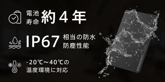 MAMORIO CARDはカードサイズの薄型デザインでありながら、IP67相当の防水・防塵性能と約4年の長寿命バッテリーを備えています。