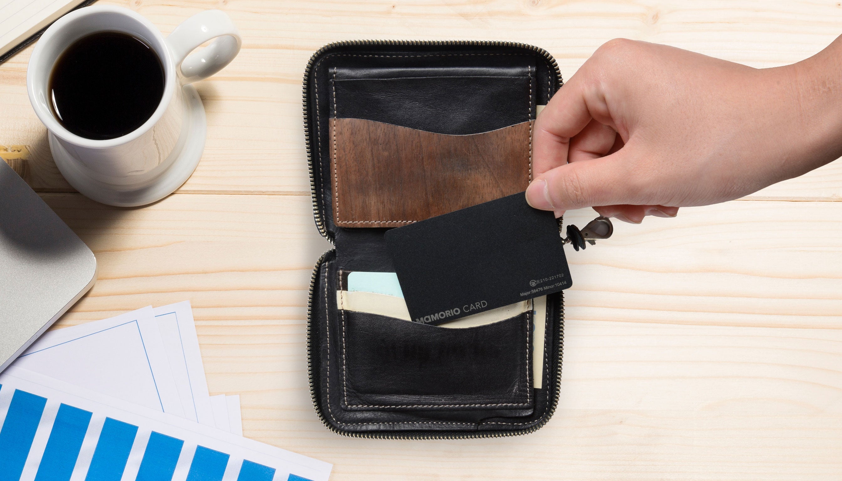 MAMORIO CARDはクレジットカードとほぼ同サイズの54mm × 85.5mm、厚さ1.65mm、重さ約11gの薄型デザイン。財布やカードケース、IDカードホルダーなどに自然に収まり、収納時の違和感を抑えます。