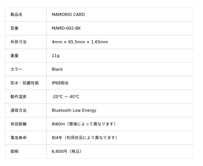 本製品は、財布やカードケースに収まるクレジットカードサイズの超薄型形状でありながら、高い耐久性と長期間の安定稼働を実現したカード型スマートタグ MAMORIO CARDの第2世代モデルです。日常生活における財布の紛失防止といった個人用途に加え、社員証や入館証などのカードと一体で携帯できる形状を活かし、カード利用を伴う業務環境での法人用途の活用も可能です。
