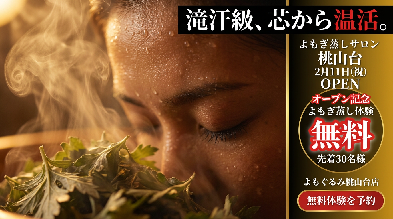桃山台店のオープンを記念して、先着30名様に名物「地獄の滝汗ブレンド」のよもぎ蒸し体験を無料でご提供いたします。通常初回価格5,980円(税込)相当のコースを無料で体験できるこの機会に、ぜひ話題のオーダーメイド調合よもぎ蒸しをご体感ください。対象: 先着30名様 (お一人様1回限り)