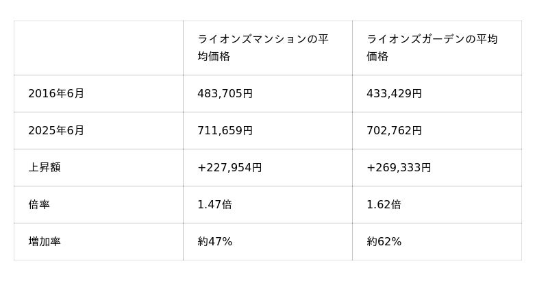 2016年6月と2025年6月を比較すると、平均価格は約50~60%程度の増加率となっており、市場全体の上昇トレンドを反映しつつ、安定的な価格推移が確認できます。