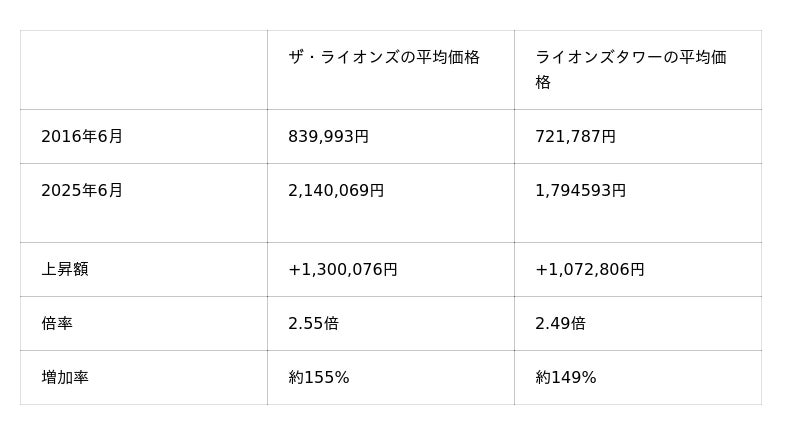 表3:2016年6月と2025年6月比較ザ・ライオンズ・ライオンズタワー平均価格(2026年1月マンションナビ調べ)※金額の単位は「円/平米」