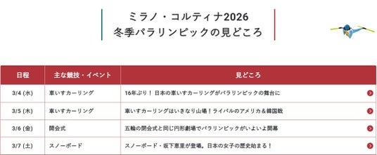 日本財団パラスポーツサポートセンター(以下「パラサポ」、所在地:東京都港区、会長:山脇康)は、運営する「パラサポWEB」内の「ミラノ・コルティナ2026冬季パラリンピック特設サイト」に、日程、見どころなどのコンテンツを追加しました。