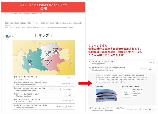 開会式はヴェローナ、競技会場はミラノ、テーゼロ、コルティナと「広域開催」が特徴のミラノ・コルティナ2026パラリンピック冬季競技大会。それぞれの会場の特徴と実施される競技が一目で分かる。