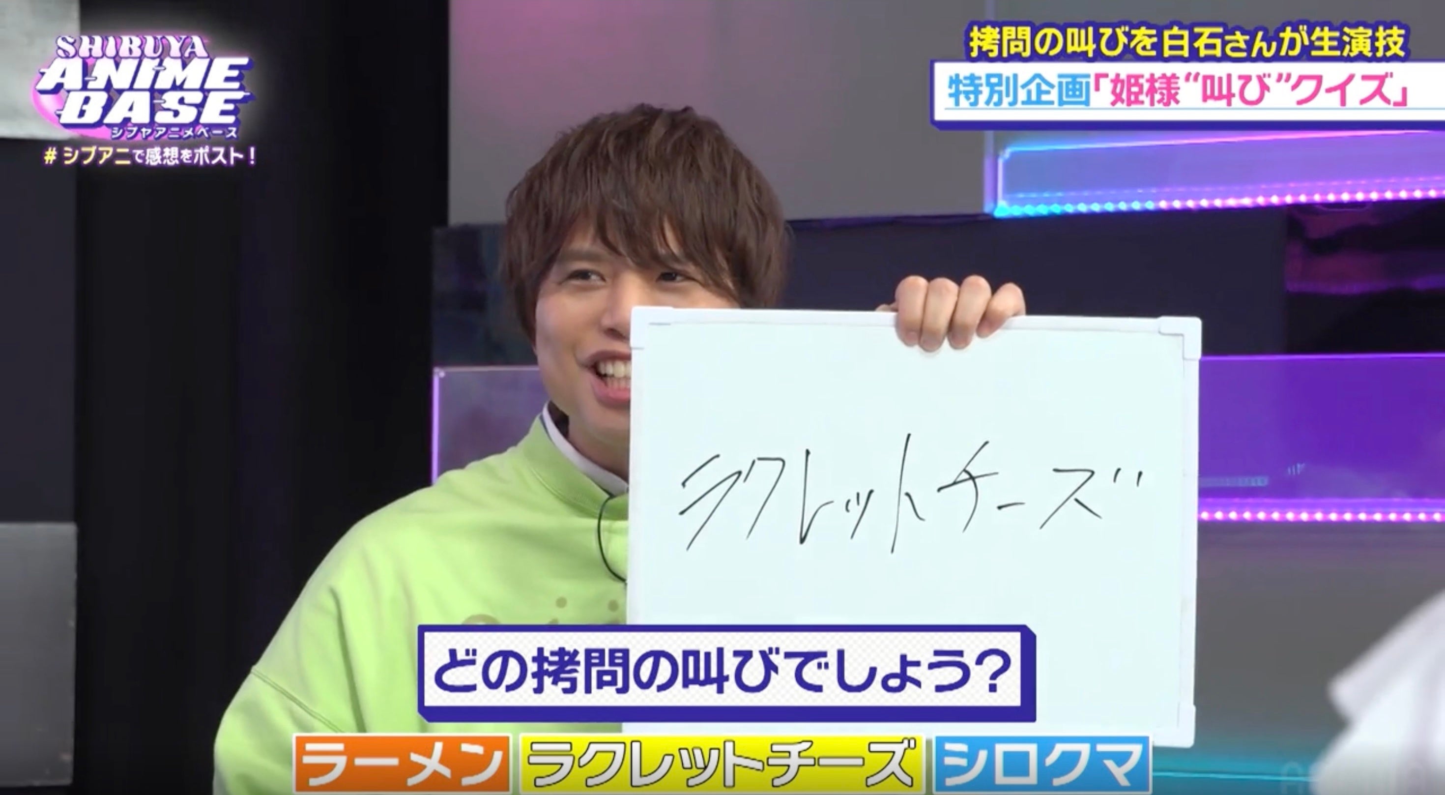 そんな姫が拷問に屈するまでに叫んだ回数は、第1期から数えてなんと31回(番組調べ)。白石が演じるバリエーション豊かな叫び声も本作の魅力です。ここでスタジオでは、「今から流れる叫び声は、ラーメン、ラクレットチーズ、シロクマのうちどの拷問シーンのものでしょう?そして、その叫び声を白石さんが生披露します」というクイズが出題されました。 白石の生の叫び声を聞いた一同は「うわ…これ難しいぞ…」と頭を抱えます。熟考の末、仲村は「チーズの伸びを感じた」という理由で「ラクレットチーズ」だと予想。そして、ハライチ・岩井、徳井青空も「ラクレットチーズ」を選択し、満場一致でラクレットチーズと予想する展開にスタジオは大盛り上がりに。しかし、正解は「シロクマ」。予想外の結果に驚く一同に対し、白石は「注目してほしいのは、“シズル感”があるかどうかなんです」「おいしいものに関しての悲鳴は、若干よだれがたれているように演じているので」と、演技への並々ならぬこだわりを明かしました。