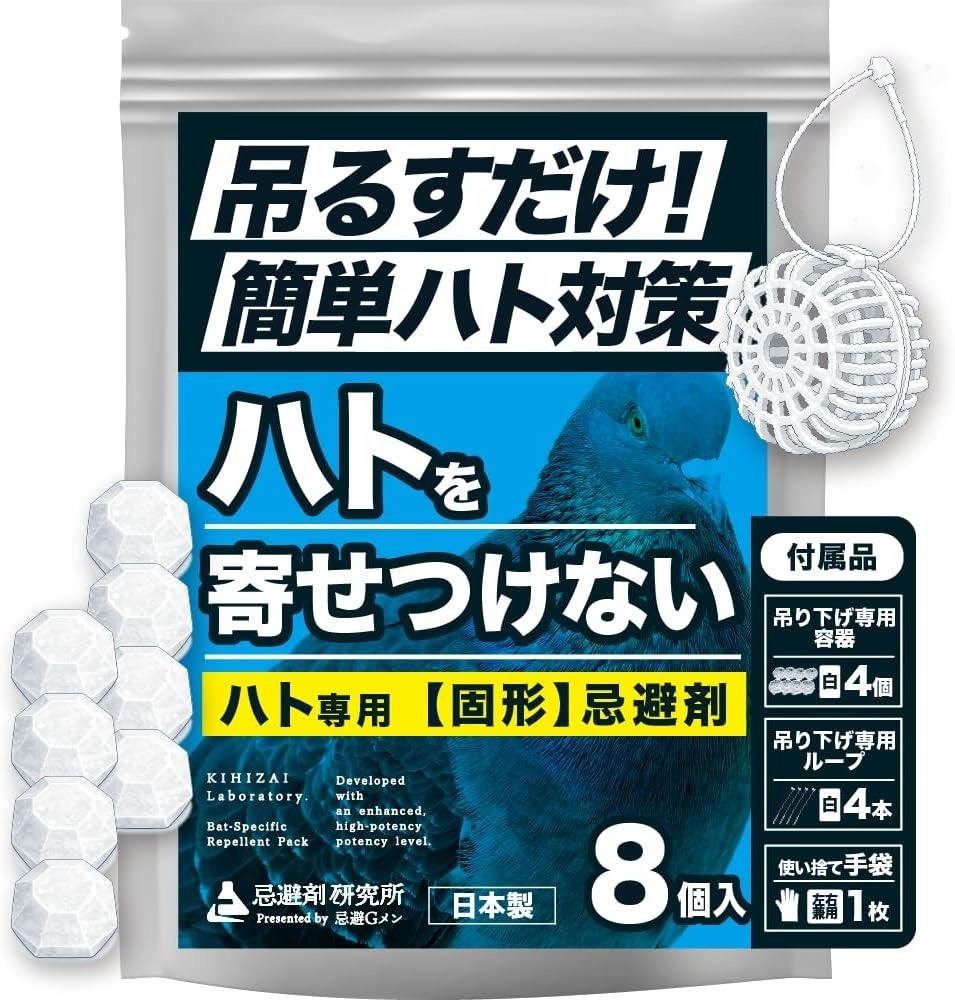 吊るすだけで簡単ハト対策。鳩用固形忌避剤気になる場所に置く、または吊るすだけの簡単設置で、鳩にとって居心地の悪い環境をつくります。
