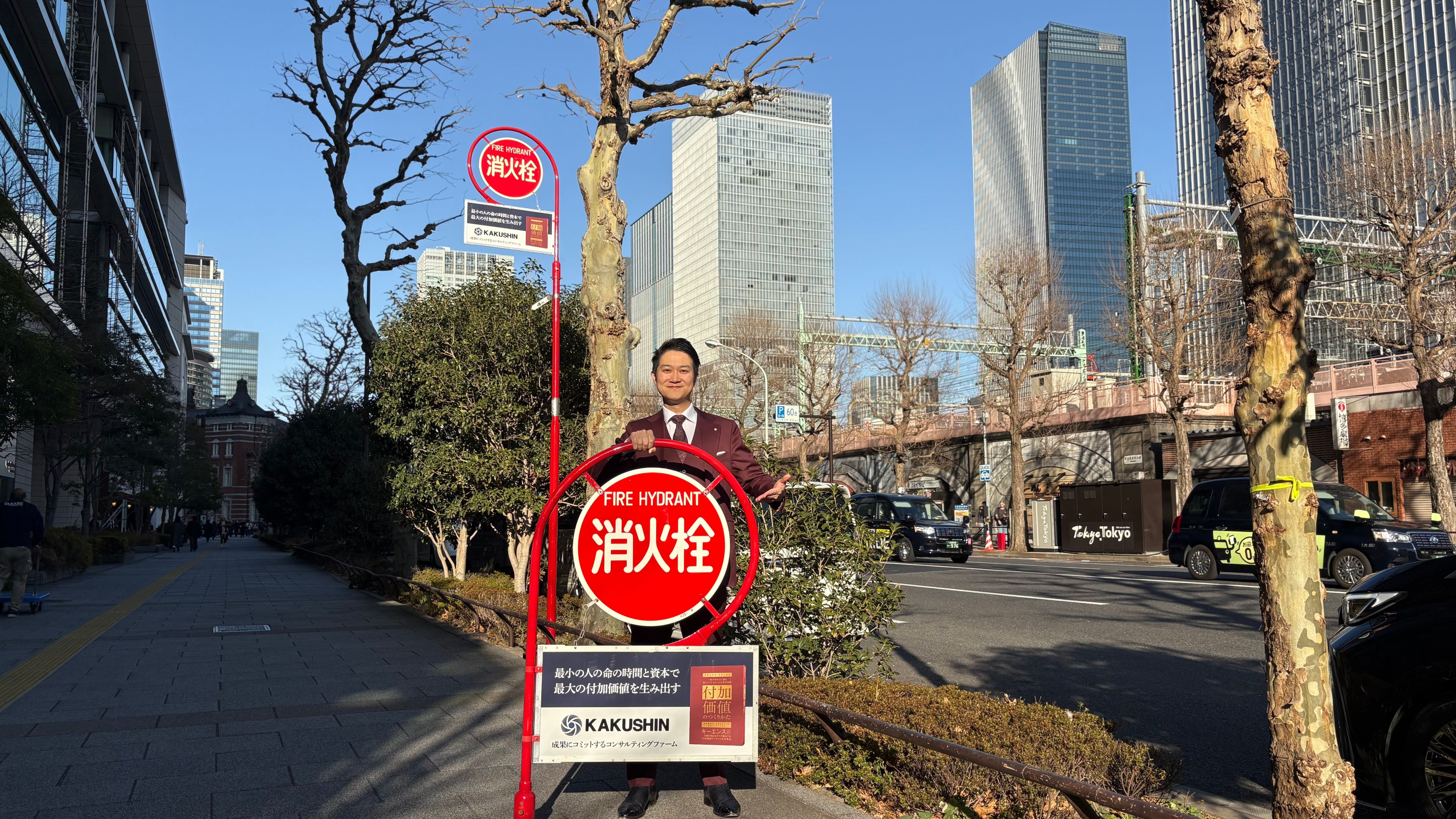 東京都内では、消火栓標識の全体の約80%の協賛枠が空いており、維持管理費の確保が難しい状態が長く続いていました。今回、株式会社カクシンの田尻代表より「看板掲出を通して地域防災への貢献と、社会インフラを支える取り組みに参画したい」とのお申し出があり、都内の主要ビジネスエリアである丸の内、銀座、高輪ゲートウェイ、品川、六本木の5エリアに合計20本の協賛看板を掲出していただくことになりました。消火栓標識は、一般の方が消火栓の真上に駐車したり、障害物を置いたりすることを防止して、災害発生時に消防隊員が迅速に活動するための重要な役割を担っています。地域の防災意識が高まる中、こうした標識を適切に維持していくためにも、協賛枠の積極的な活用は大切な取り組みとなっています。