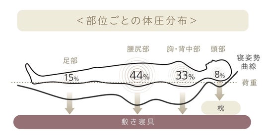 マットレスには、程よいクッション性で体を受け止めバランスよく体圧を分散する「体圧分散性」と、なだらかなS字型を保ち自然で無理のない寝姿勢を保つために体をしっかり支える「寝姿勢保持性」、この相反する2つの条件を満たすことが求められます。また、同じ姿勢で寝ていると血行が滞ったり、体温が上昇するため、寝返りがしやすいことも良いマットレスの条件です。やわらかすぎるとお尻など重たい部分が沈み込んで寝姿勢を保持できず、一方、硬すぎると肩やお尻など凸部分だけで体を支えることとなり、体に負担がかかります。大切なのは、適度に体が沈み込み、仰向け寝と横向き寝ともに自然な寝姿勢を保てることです。体格は人それぞれ異なるため、体に合った マットレスを選ぶことが睡眠の質の向上につながります。
