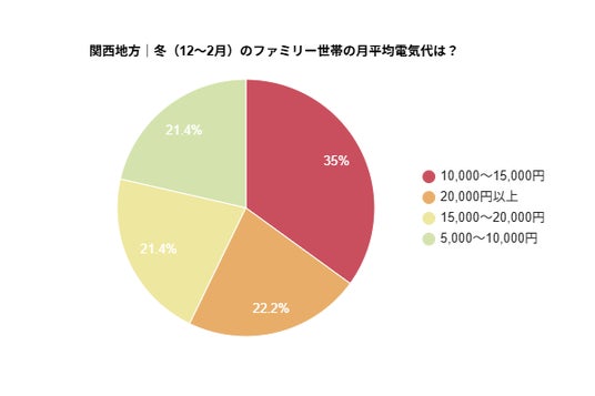 冬の電気代について、関西地方の3人以上のファミリー世帯では「10,000~15,000円」の世帯が35%で最も多い結果となりました。次いで、「20,000円以上」と「15,000~20,000円」の世帯がそれぞれ約2割を占め、暖房や給湯器の使用増加により電気代が高くなる傾向が見られます。