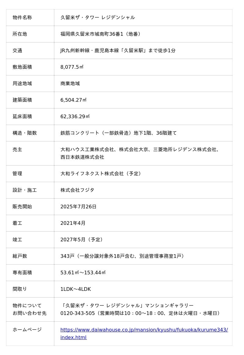大和ハウス工業株式会社(本社:大阪市、社長:大友浩嗣)、株式会社大京(本社:東京都渋谷区、社長:細川展久)、三菱地所レジデンス株式会社(本社:東京都千代田区、社長:宮島正治)および西日本鉄道株式会社(本社:福岡市中央区、社長:林田浩一)の4社共同企業体は、2025年7月より福岡県久留米市で分譲マンション「久留米ザ・タワー レジデンシャル」を販売していますが、このたび本物件が2025年に九州地域で販売された新築分譲マンションにおいて成約戸数1位(※1)となりましたので、お知らせします。
