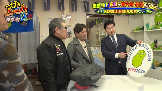 満腹になったおっさんたちは、石切参道にある「ナウル共和国石切参道パビリオン」へ立ち寄る。大阪・関西万博に出展していたパビリオンをそのまま移設し、常設オープンしてているという。さっそく3人は店内を巡って気になるグッズを購入。