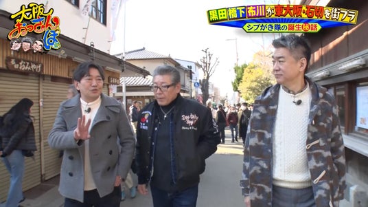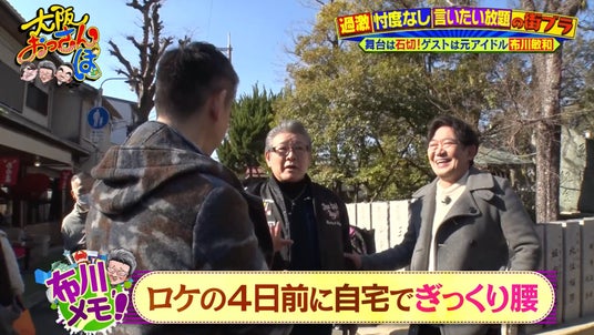 黒田と橋下は石切参道で、この日のゲスト、元シブがき隊の“ふっくん”こと布川敏和と合流。昨年還暦を迎えたという布川に、黒田は「大阪のおっさん100%の視聴率なんで、よりおっさんの布川さんを見ていただきたい」と期待を寄せる。すると布川は、ロケの4日前にぎっくり腰になったと明かし、早くもおっさん全開。