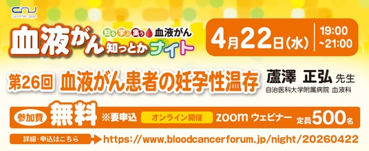 認定 NPO 法人キャンサーネットジャパン(東京都文京区 理事長 岩瀬 哲)は、2023年より毎月1回、血液がんに関するオンラインセミナー「血液がん知っとかナイト」を実施しています。26回目の開催となる2026年4月は「血液がん患者の妊孕性温存」をテーマに開催する運びとなりました。