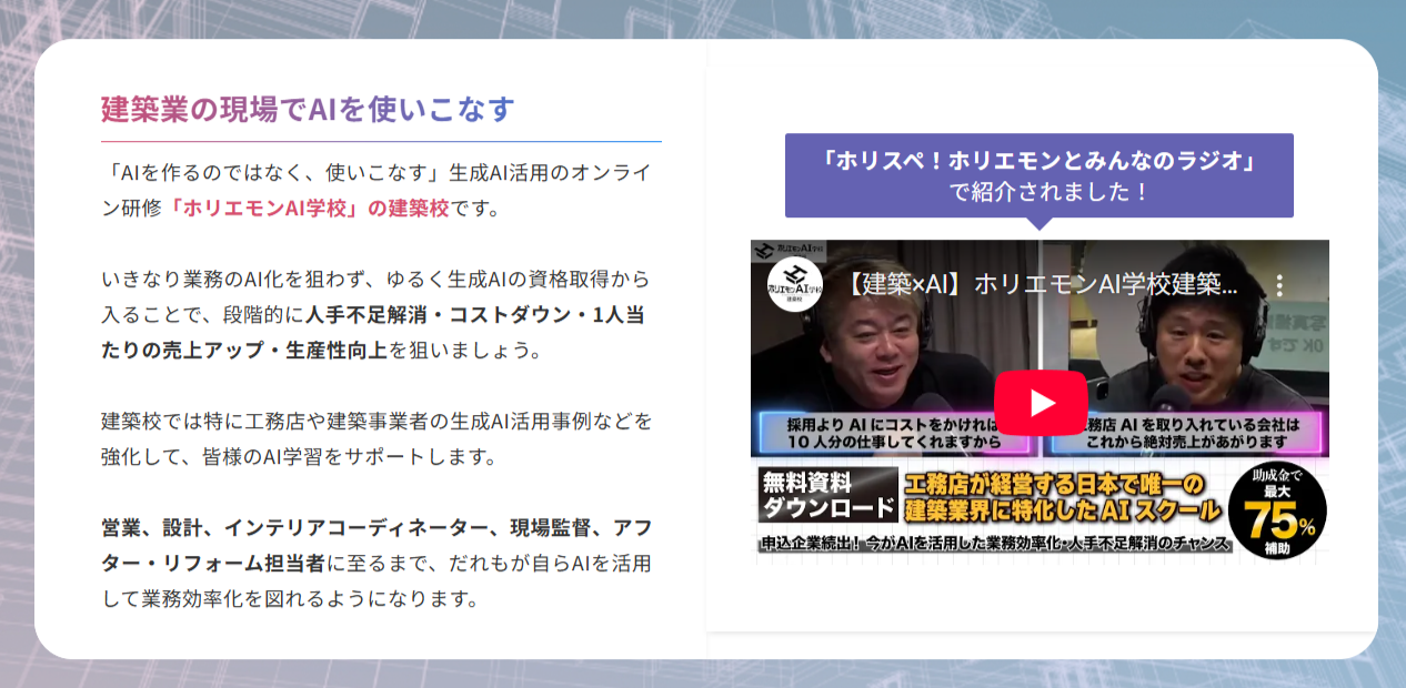 「ホリエモンAI学校 建築校」新サイトのトップページ(キャプチャ)