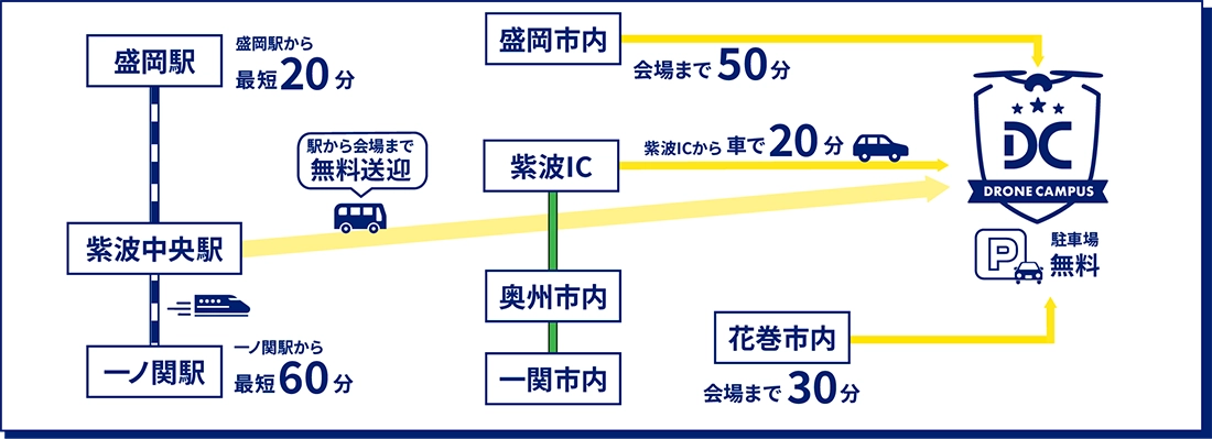「ドローンキャンパス 岩手の空」は、閉校した小学校の施設を講習場所として使用し、広々とした空間で落ち着いてドローン操縦を学べる環境を整えました。 本講習は、盛岡市内から車で約50分、花巻市内から約30分という立地に加え、一関方面からも紫波ICを経由してスムーズにご来場いただけます。また、電車をご利用の方のために「紫波中央駅」からの無料送迎も実施。盛岡駅(最短20分)や一関駅(最短60分)からのアクセスも良好で、県内全域から受講生を広く募集いたします。 「1泊2日」の短期集中形式により、橋梁点検や災害対策など、地域の課題解決に貢献できるドローンパイロットの育成を加速させます。■講師(インストラクター)を同時募集