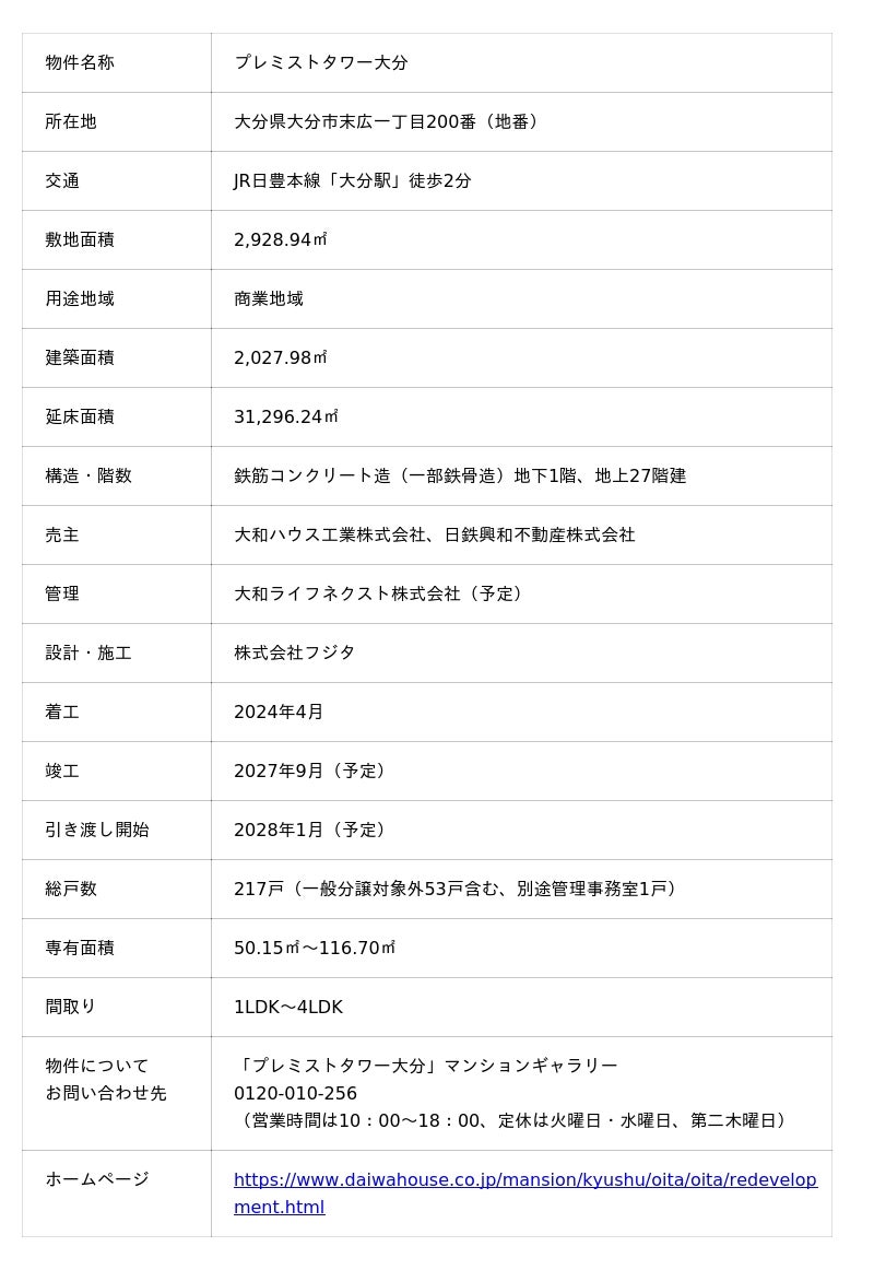 大和ハウス工業株式会社(本社:大阪市、社長:大友浩嗣、以下「大和ハウス工業」)、日鉄興和不動産株式会社(本社:東京都港区、社長:三輪正浩、以下「日鉄興和不動産」)は、大分市における分譲マンション「プレミストタワー大分」の概要が決定しましたので、お知らせします。
