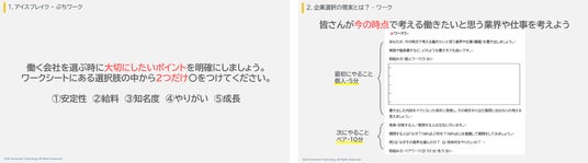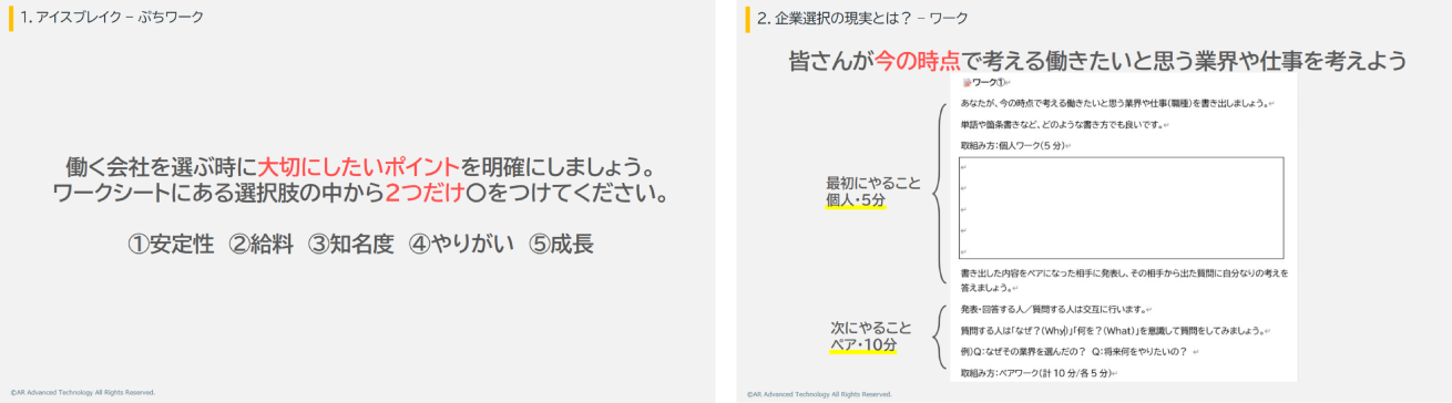 ARIでは、帝京大学出身のエンジニアが現場で活躍しています。当日は就職活動や企業選択の考え方に関する講義に加え、価値観や働く意味を言語化するワークを実施しました。