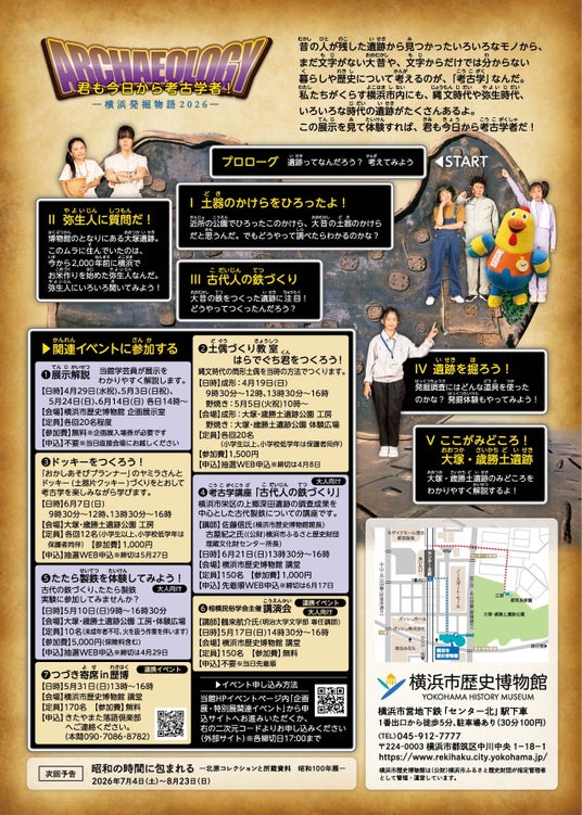 横浜市歴史博物館では令和8年4月18日より企画展「君も今日から考古学者!―横浜発掘物語2026―」を開催します。本展は、考古学と横浜の遺跡について楽しく学ぶことができる体験型の展覧会です。