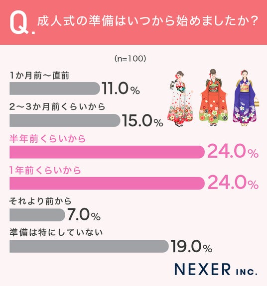 成人式の準備は「1年前~半年」から始める層が半数を占め、早期化が顕著です。