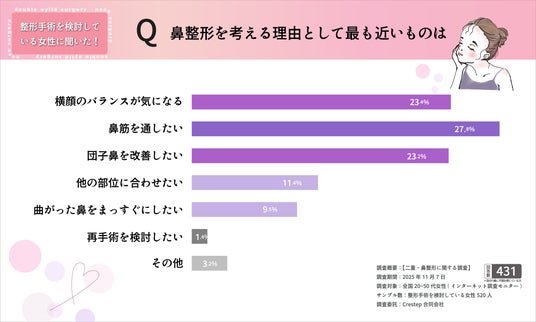 鼻整形を検討する理由として最も多かったのは「鼻筋を通したい」(27.8%)。