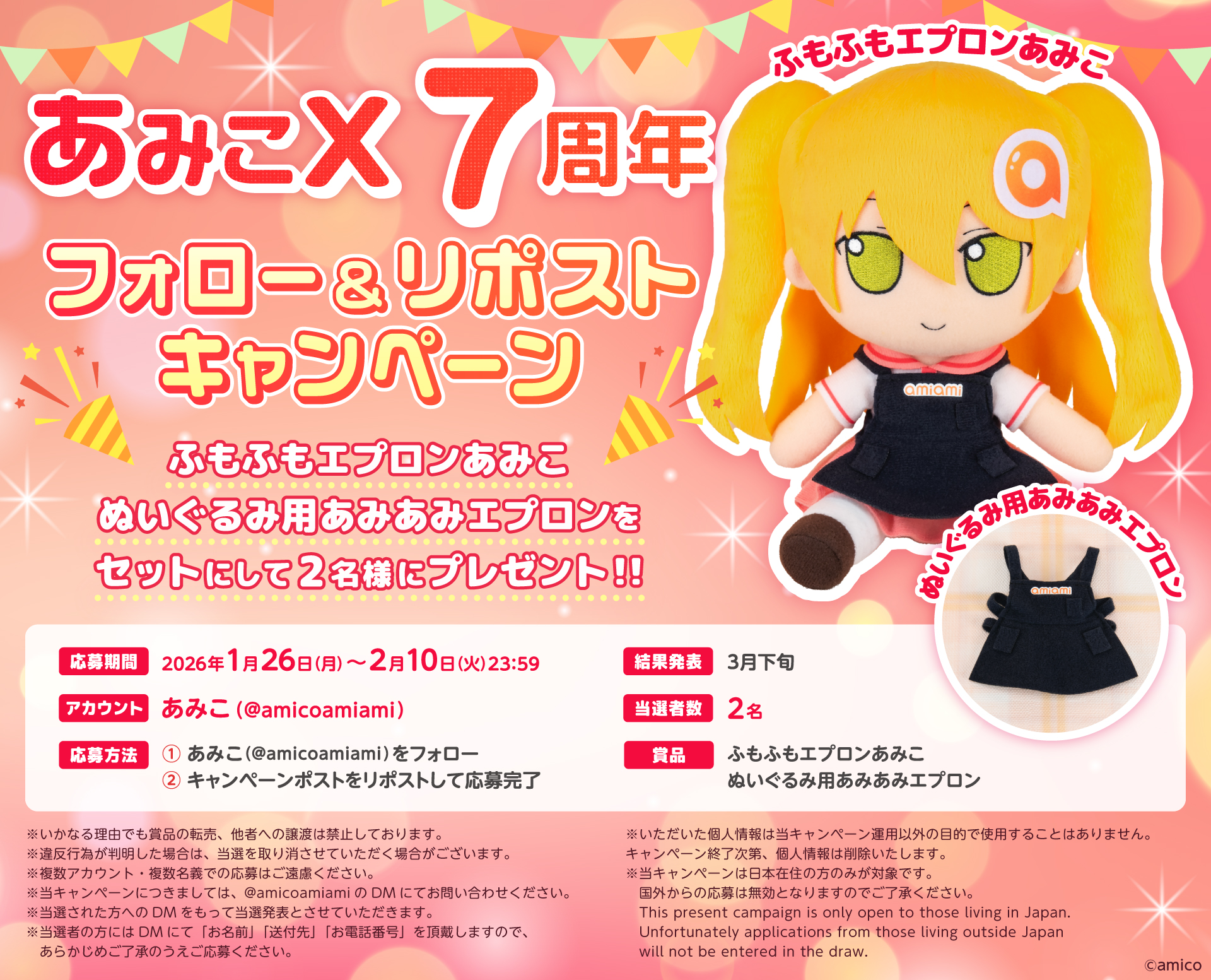 『あみあみ』の看板娘「あみこ」の、Xアカウント7周年を記念してフォロー&リポストキャンペーンを開催中。 -