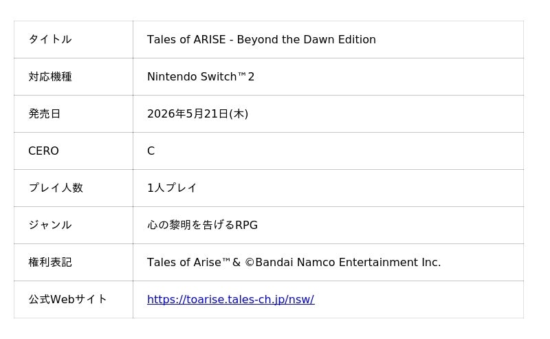 株式会社バンダイナムコエンターテインメントは、「Tales of ARISE - Beyond the Dawn Edition」をNintendo Switch(TM)2 にて、2026年5月21日(木)に発売することをお知らせいたします。