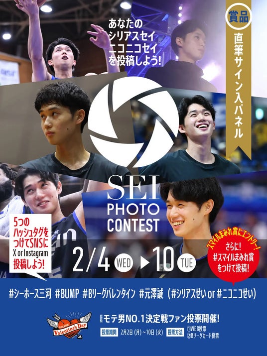 今シーズンも「B.LEAGUE モテ男No.1決定戦 2026」が開催され、シーホース三河からは#5 元澤誠選手がエントリーしています。1月28日(水)のホームゲームでは、写真展(#ニコニコせい #シリアスせい 展)を開催いたしました。