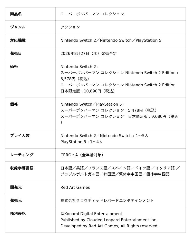 株式会社クラウディッドレパードエンタテインメント(本社:東京都品川区、代表取締役:陳 云云)は、多くのお客さまに長年親しまれている「スーパーボンバーマン」シリーズの5作品を収録した『スーパーボンバーマン コレクション』(対応機種:Nintendo Switch(TM) 2/Nintendo Switch(TM)/PlayStation(R)5)のパッケージ版を、日本を含めたアジア地域に向けて、2026年8月27日(木)に発売します。
