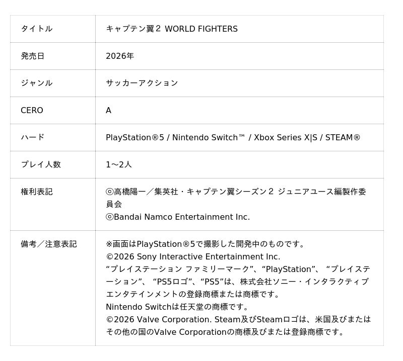 株式会社バンダイナムコエンターテインメントは、 『キャプテン翼』家庭用ゲーム最新作として、PlayStation(R)5 / Nintendo Switch(TM) / Xbox Series X|S / STEAM(R) で展開するサッカーアクションゲーム「キャプテン翼2 WORLD FIGHTERS」を2026年に発売することをお知らせいたします。