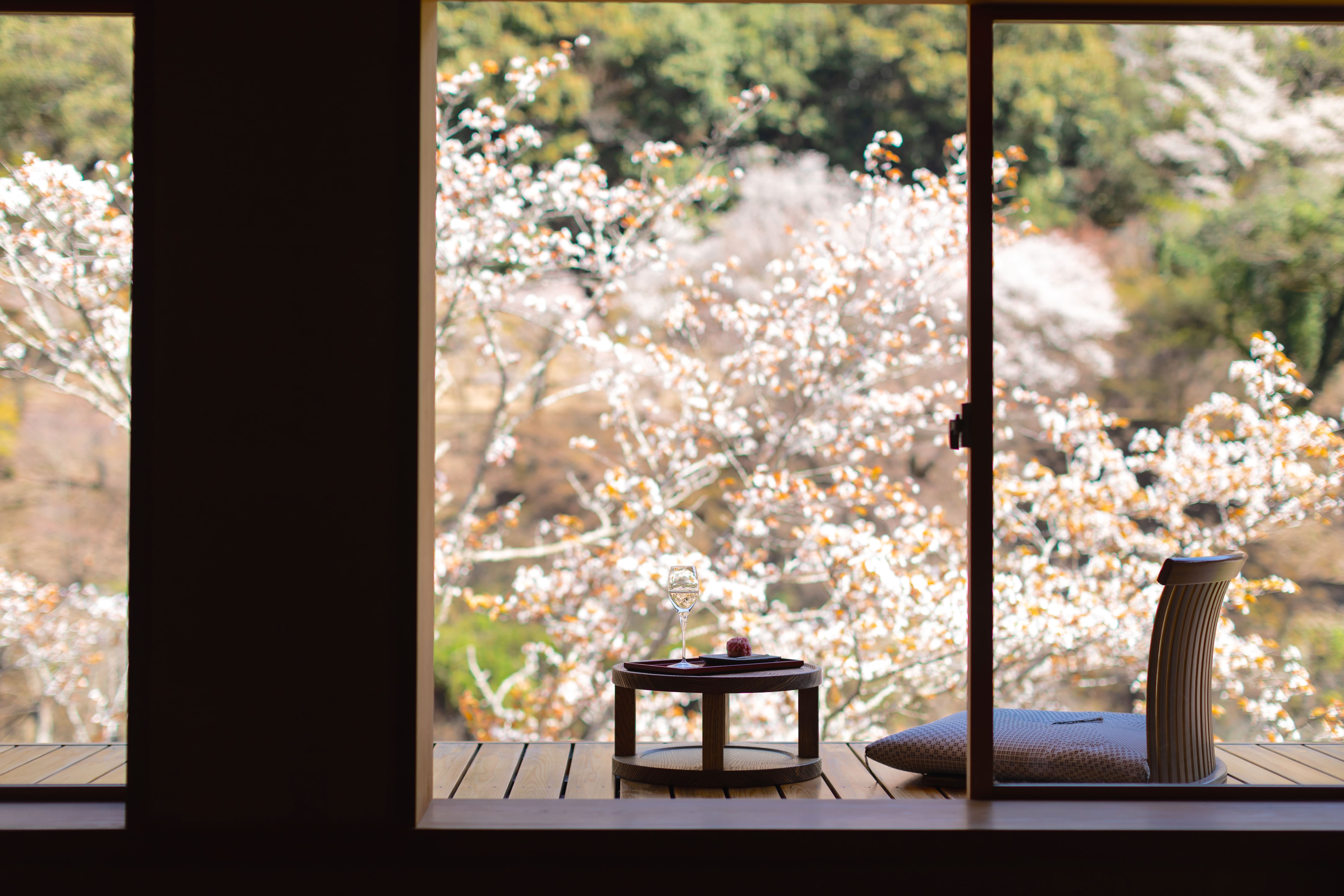 星のや京都が位置する嵐山は「日本さくら名所100選」(*1)のひとつに選定されており、桜の時期には観光客で賑わいます。一方で、星のや京都は嵐山の名所・渡月橋から約1km離れた静かな渓谷に位置しており、喧騒から離れてゆっくりと桜を愛でられる唯一無二の場所です。つぼみ、満開の花、散りゆく花吹雪から花筏(はないかだ)まで、刻々と移り変わる自然の情景を間近で感じ、心ゆくまで満たされる時間を過ごしてほしいという想いから、この特等席を提案します。