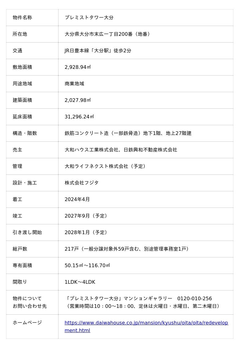 大和ハウス工業株式会社(本社:大阪市、社長:大友浩嗣、以下「大和ハウス工業」)、日鉄興和不動産株式会社(本社:東京都港区、社長:三輪正浩、以下「日鉄興和不動産」)は、大分市における分譲マンション「プレミストタワー大分」の概要が決定しましたので、お知らせします。