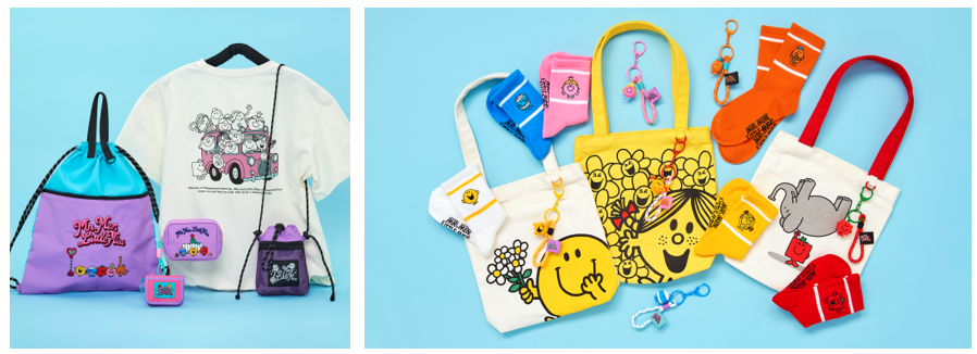 日常やイベントで取り入れやすい、Tシャツ、ナップサック、ミニショルダーバッグ、ポーチ、ミニコインケースのほか、キャラクターそれぞれの個性に合わせてデザインをあしらった、ミニトートバッグ、ソックス、立体キーホルダーの全23アイテムをラインアップ。