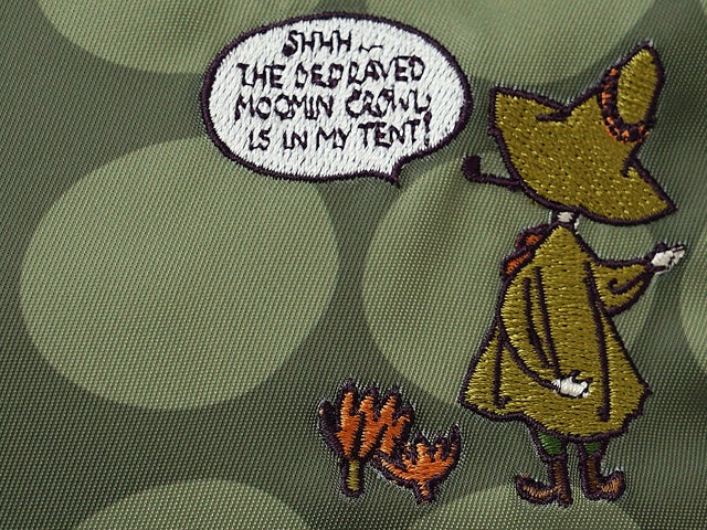 バッグの主役となるスナフキンは、プリントではなく丁寧な「刺繍」で表現しました。刺繍ならではのぷっくりとした立体感と繊細な光沢は、プリントでは出せない上質な奥行きを生み出し、まさに大人のための特別なアクセントです。