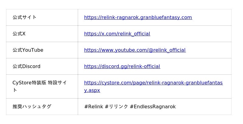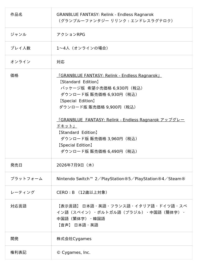 ゲームの企画・開発・運営事業を展開する株式会社Cygames(以下、サイゲームス 本社:東京都渋谷区、代表取締役社長:渡邊耕一)は、Nintendo Switch(TM) 2/PlayStation(R)5/PlayStation(R)4/Steam(R) 向けアクションRPG『GRANBLUE FANTASY: Relink - Endless Ragnarok』の発売を決定いたしました。