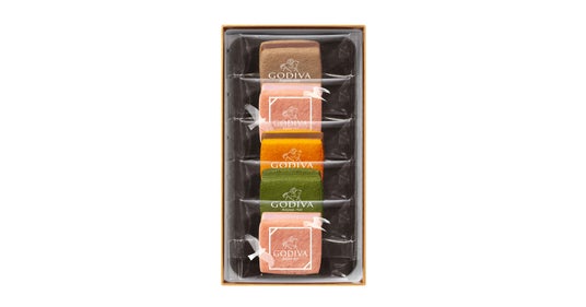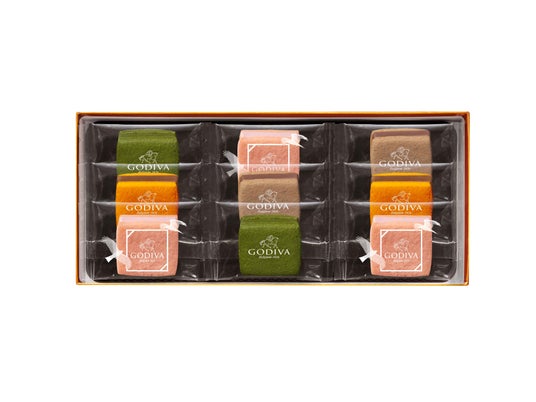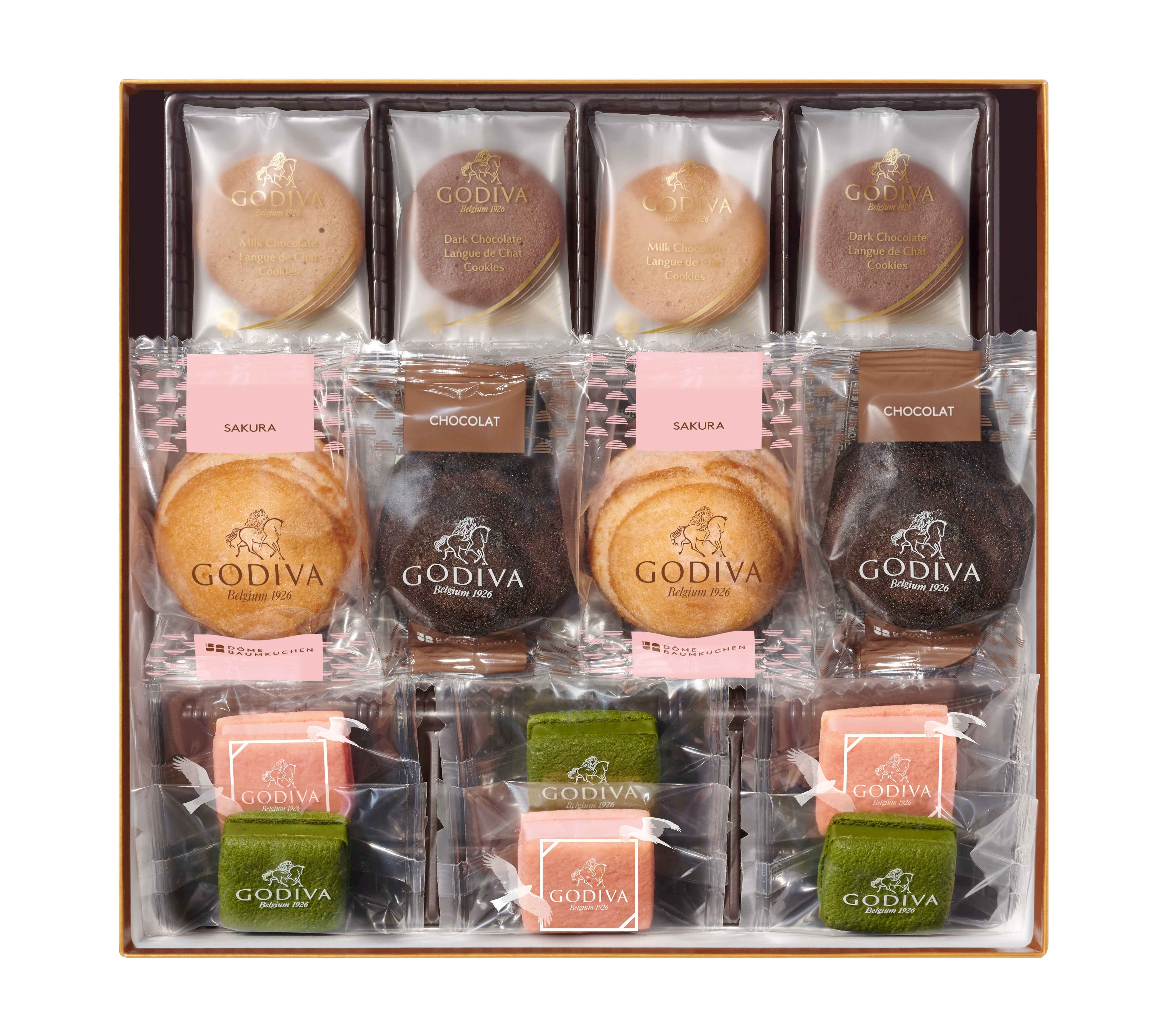 ゴディバの焼き菓子「ラングドシャクッキー」「サブレショコラ」「ドームバームクーヘン」の3種類を色とりどりにアソートしました。