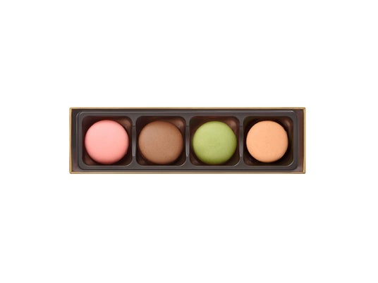 チョコレートソースやキャラメルソースを閉じ込めた贅沢なドーム型のチョコレートと目にも鮮やかなマカロンでガナッシュをサンドしました。食感の異なるチョコレート、マカロン、ガナッシュのマリアージュをお楽しみください。期間限定の「桜&ホワイトチョコレート」と「塩キャラメル」「宇治抹茶&ミルクチョコレート」「ミルクチョコレート」の4種類のフレーバーをカラフルに詰め合わせました。