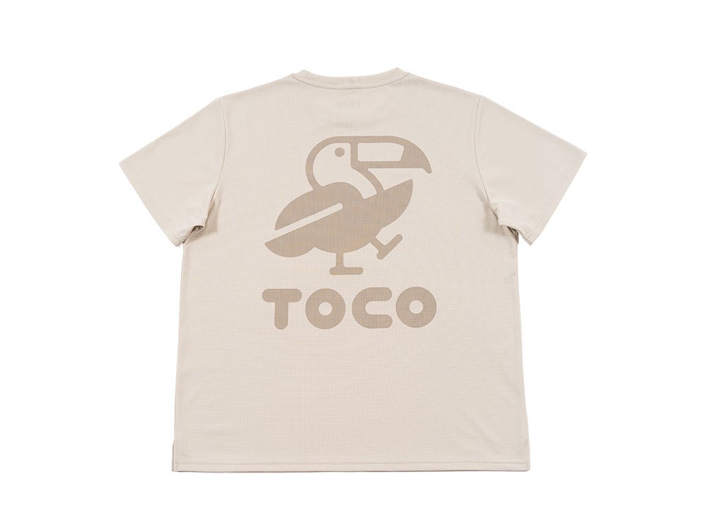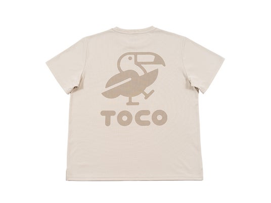 Hello,world. I'm TOCO.片手を挙げて軽快に挨拶しているようなTOCOのキャラクターロゴ、通称「TOCOちゃん」。背中に大きくプリントしつつ、落ち着いた色合いでまとめました。