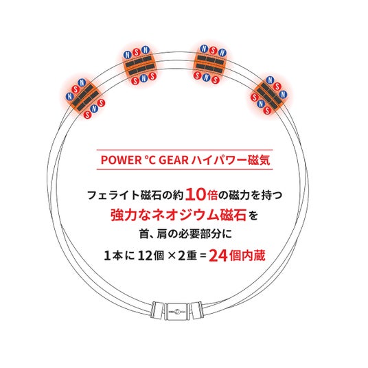 一般的なフェライト磁石と比べて約10倍の磁力を持つネオジウム磁石を使用し、首元に160mT磁石を12個配置。二重構造により合計24個の磁石を搭載することで、首・肩まわりの血行をサポートし、日常のコンディションケアを意識した設計です。