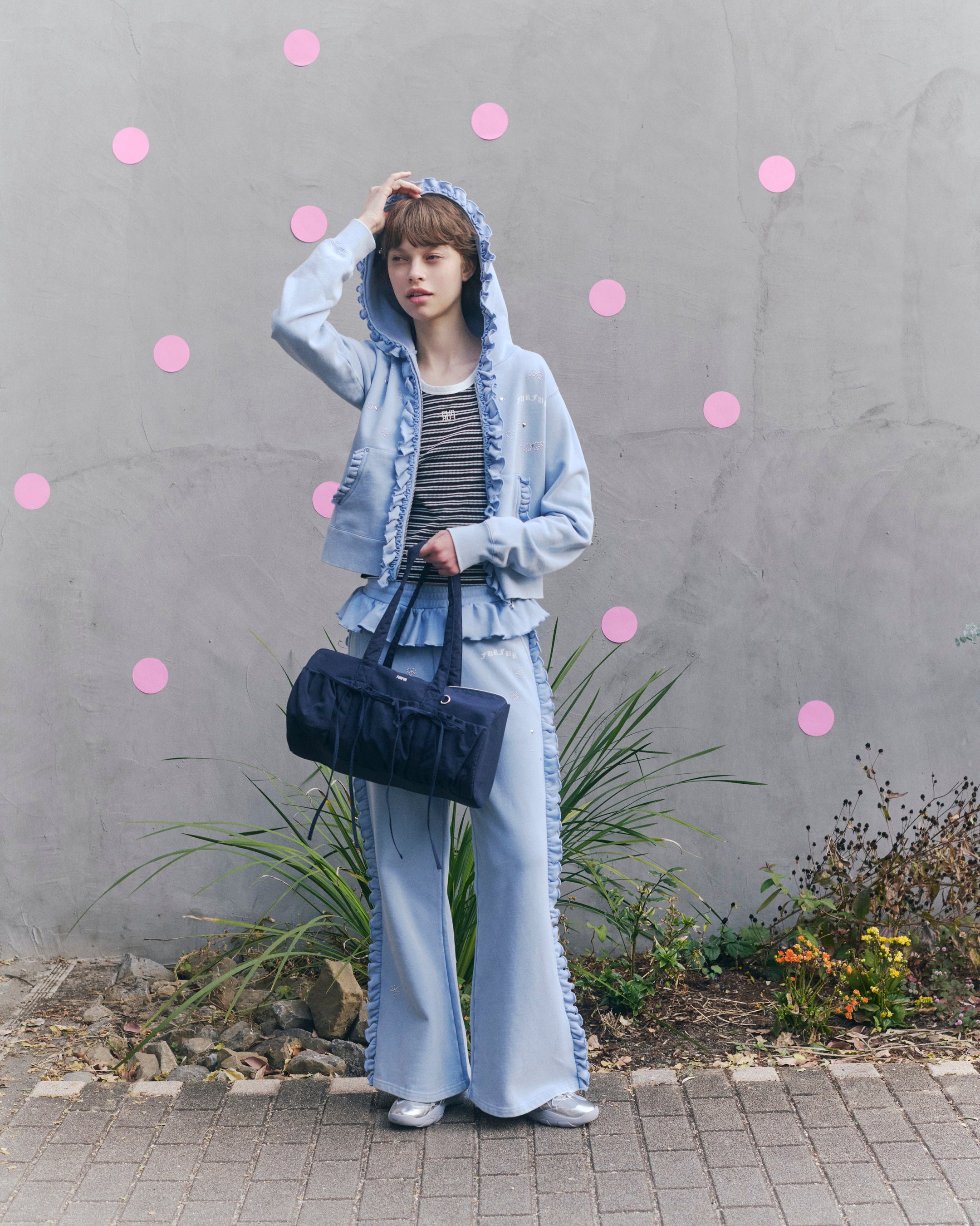 ミリタリーなアイテムに施されたフラワー刺繍、リラクシーなフーディーセットアップに配したフリルディテール。