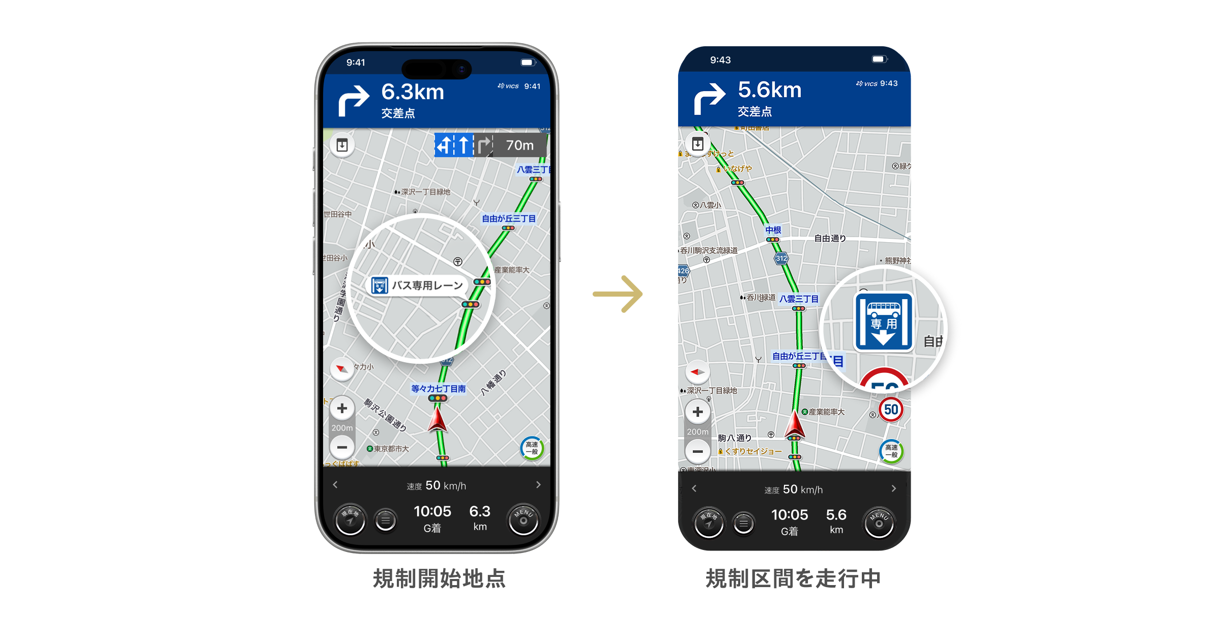 ルートの視認性を保ちながら、規制の開始地点を事前に知らせることで、余裕を持った車線変更をサポートします。