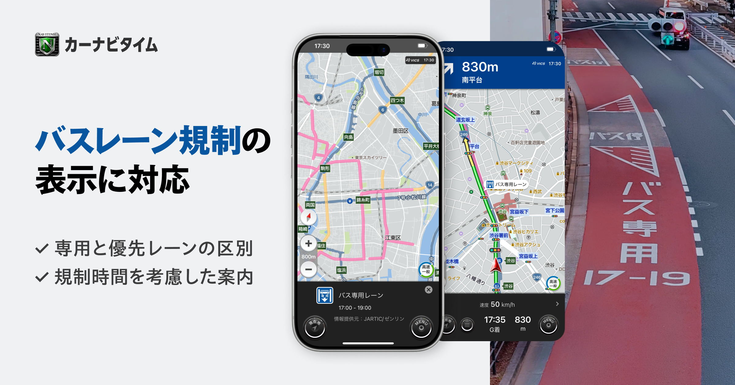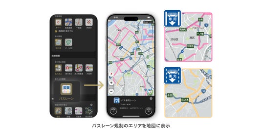 株式会社ナビタイムジャパン(代表取締役社長:大西 啓介、本社:東京都港区)は、2026年2月6日(金)より、カーナビアプリ『カーナビタイム』にて、「バス専用レーン」「バス優先レーン」の表示機能を提供開始いたします。ドライバーの交通違反防止と、路線バスのスムーズな運行に繋がる機能で、本アプリのユーザーであるドライバーと、公共交通機関の利用者双方の快適な移動をサポートします。