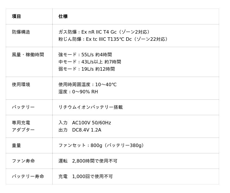 に区分され、危険度の高いゾーンに対応する機器は、より広い範囲のゾーンで使用できます。この設計により、最大風量55 L/sの高出力を維持しつつ、従来品「クールファンEP」と比較して大幅なバッテリー軽量化を実現しました。ゾーン1対応が必要な環境では、従来品「クールファンEP」をご使用ください。両製品を使い分けることで、幅広い防爆環境をカバーできます。